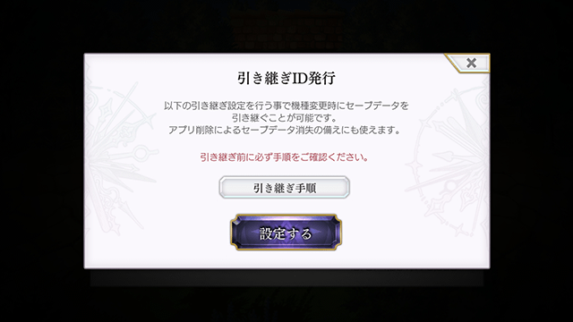 セーブデータを引き継ぐ予定がない場合でも、事前に設定を済ませておくことで、端末の不具合などでデータが端末から消えてしまった際にも、元に戻すことができるようになります。安心してプレイしていただくためにも、事前に設定を済ませ、必要な情報を控えておくことをおすすめいたします。