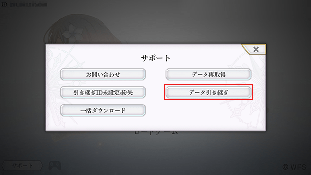 【1】引き継ぎ先の端末に「アナザーエデン」をインストールし、タイトル画面左下の[サポート]から[データ引き継ぎ]を選択します。