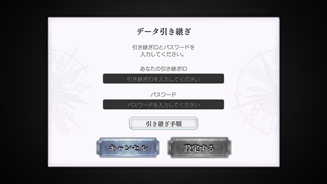 【2】[発行したIDで引き継ぎ]を選択し、STEP1で設定した引き継ぎIDとパスワードを入力して[設定する]を押してください。 確認画面が表示されたら、セーブデータが正しいことを確認し[引き継ぐ]を押してください。以上で引き継ぎは完了となります。
