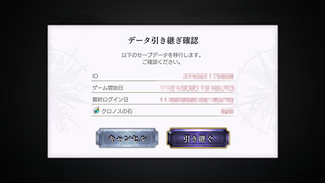 【3】確認画面が表示されたら、セーブデータが正しいことを確認し[引き継ぐ]を押してください。以上で引き継ぎは完了となります。